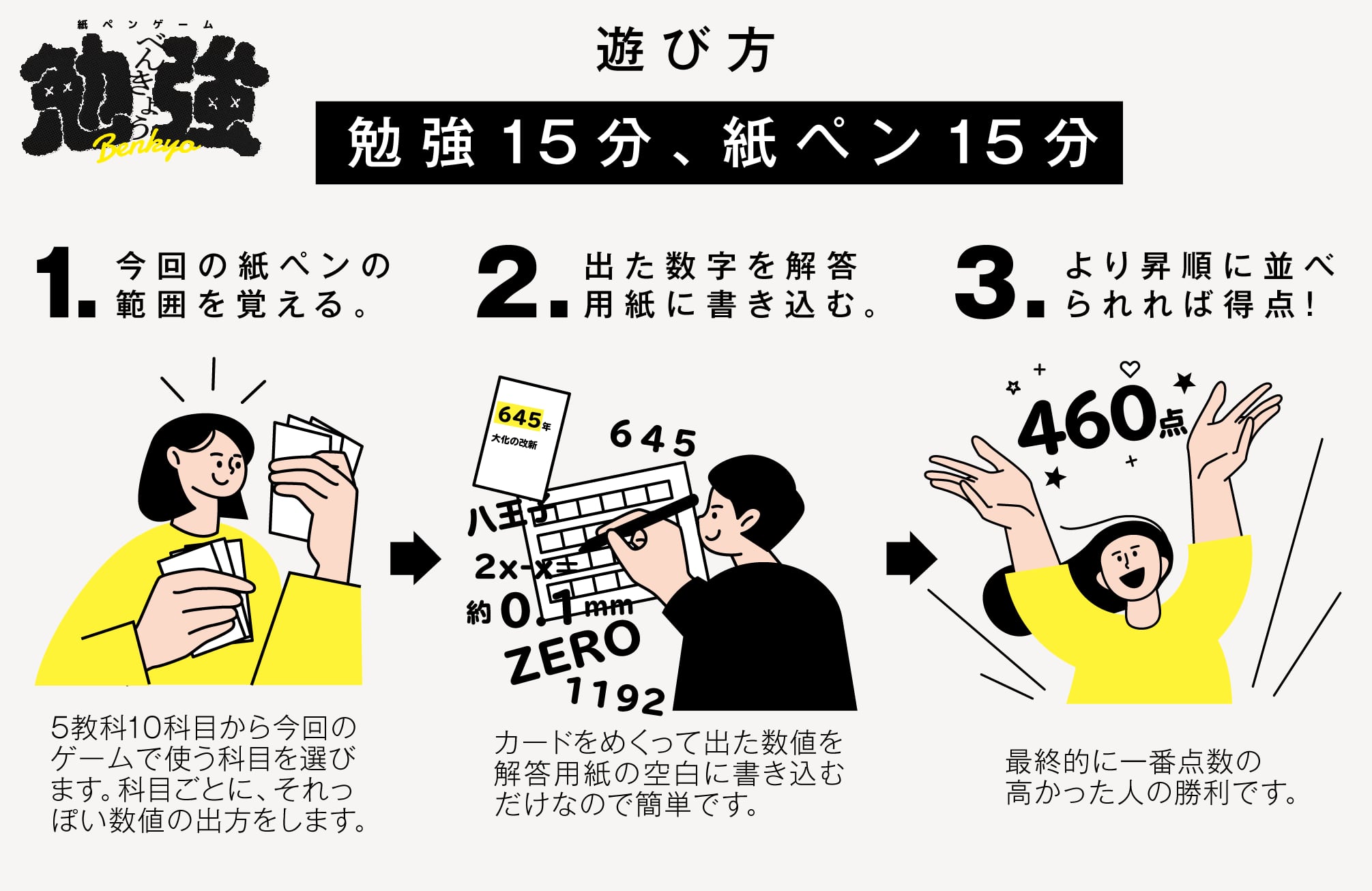 プレイヤーは5教科(国語・英語・数学・理科・社会)をそれぞれ3分ずつ「勉強」します。 計15分の勉強が終わると、いよいよ15分の「テスト」が始まります。