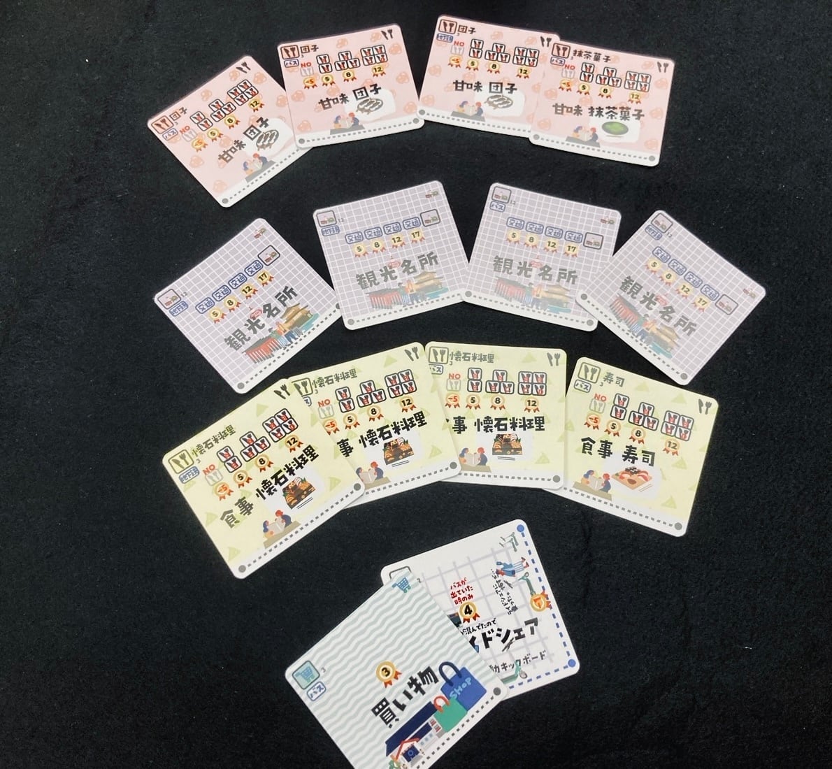 京都の交通機関を利用して巡り、観光や食事を満喫することを目指すゲーム。